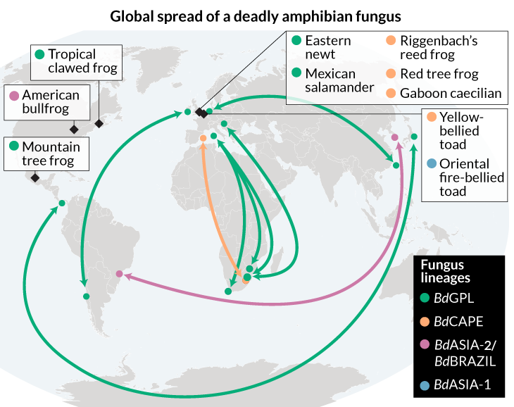 How the fungus traveled far and fast is less of a mystery. All the lineages show up in animals that have been traded internationally, often as exotic pets, the team reports in the May 11 Science.