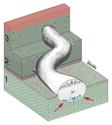 PROFILE OF A MUCKRAKER. An S-shaped mass of sandstone that contains the fossils of three dinosaurs (arrows, above) is hardened sediment that filled the burrow of Oryctodromeus cubicularis (below), a newly described dinosaur.