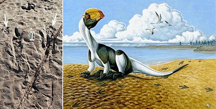 Fossil handprints made by a crouching theropod reveal that those meat-eating bipedal dinosaurs had palms that always faced inward, a sign that these creatures abandoned the use of their forelimbs as legs early in their evolution.
