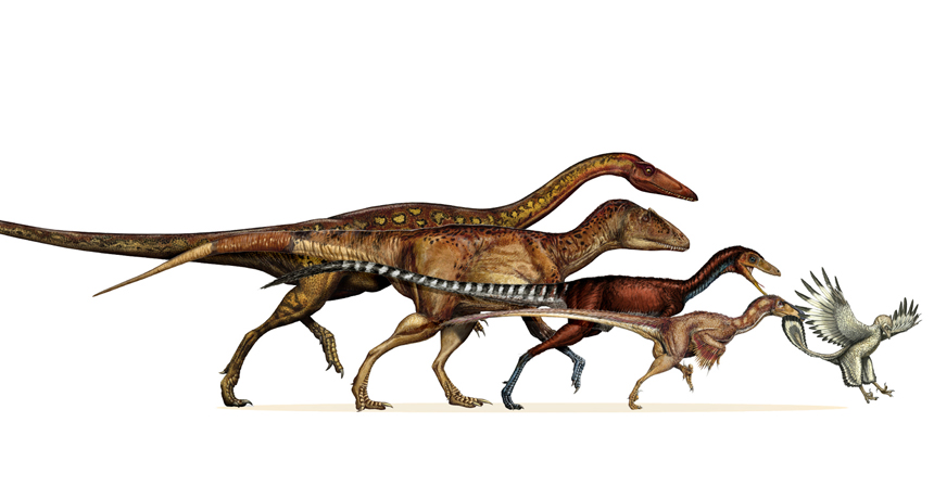 THE DESCENT OF BIRDS Dinosaur ancestors of birds shrank steadily for more than 50 million years. Left to right: the ancestral neotheropod (about 220 million years old), tetanuran, coelurosaur, paravian and Archaeopteryx (150 million years old).