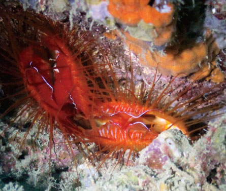 FLASHING LINES Up close, a disco clam native to Indo-Pacific waters flashes bright lines along the top and bottom edges of its mantle.