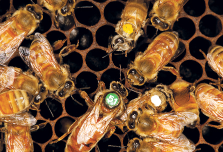 Worker bees surround a queen (numbered). Paint splotches distinguish a forager bee from a nurse. New research suggests chemical tags on DNA may be involved in training worker bees for new jobs.