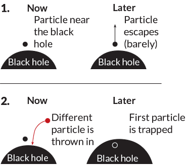 Imagine a black hole with a particle nearby, in danger of falling in (1). Sometime later, that particle may escape. But if another particle is tossed in (2), the black hole will expand, preventing the original particle from getting away. Making a minor change to the black hole changes the outcome — an indicator of chaos.
