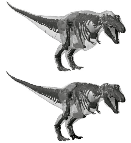 First, the team scanned museum specimens with lasers to create high-resolution, 3-D models of the dinosaurs’ skeletons. Data from studies of living creatures, Manning notes, allowed the team to account for low-density spaces such as lungs, air sacs and even sinuses.