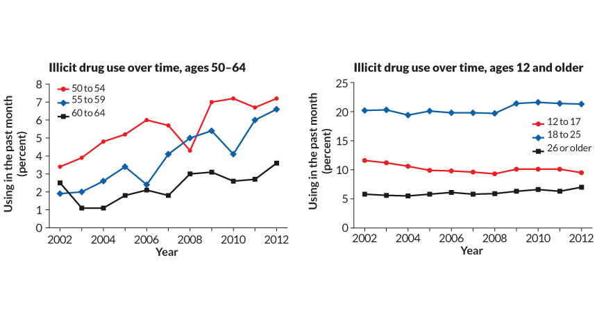 The use of illicit drugs has declined slightly over the last decade among teens but is growing more common in people over age 50. New data from the U.S. Substance Abuse and Mental Health Services Administration show that 23.9