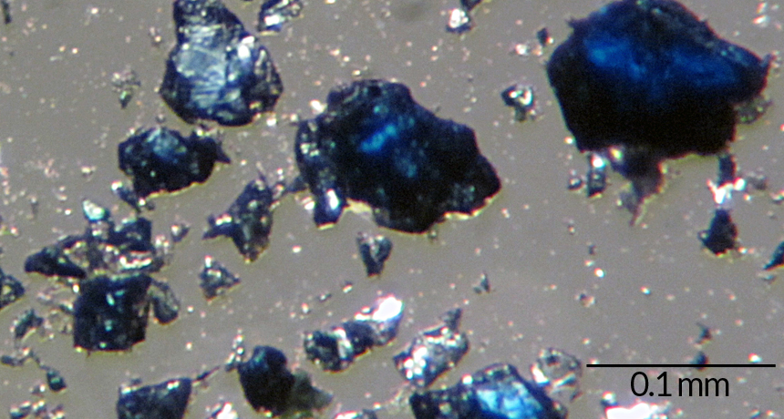 BOLT FROM THE BLUE New lab experiments with the blue mineral ringwoodite (shown) that mimicked the intense pressures and temperatures of the Earth’s mantle suggest that its midsection, or transition zone, holds a considerable amount of water.