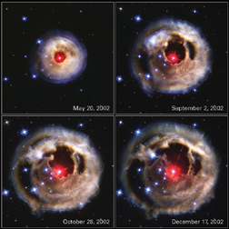 Although the body, known as V838 Monocerotis, has since faded, the light from the outburst continues to reflect off surrounding dust. As light bouncing off dust farther and farther from the star reaches Earth, the circular reflections provide an expanding cross-section of the star’s envelope of dust. The light-echo has now expanded to twice the size of Jupiter, as seen from Earth, and may be visible until about 2010. The Hubble images reveal that the star is 20,000 light-years from Earth.
