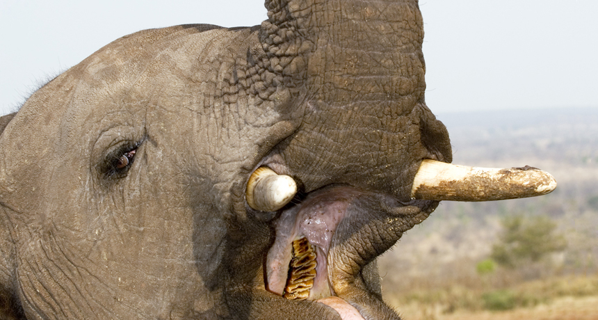 CHOMPER CHANGE African elephants and their relatives began grazing on the savanna millions of years before they evolved teeth like those seen inside this elephant’s mouth, which are capable of grinding tough, gritty grasses.