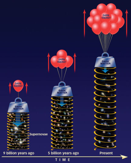 Dark energy, or repulsive gravity, was always present, but initially unimportant. The youthful universe, though expanding, was relatively compact and dense. The high-mass density enabled gravity’s tug to reign supreme. But the continuing expansion of the universe diluted the density of matter. Eventually, about 5 billion years ago, the cosmic push of dark energy won the tug-of-war against gravity’s pull, and cosmic expansion began to accelerate.
