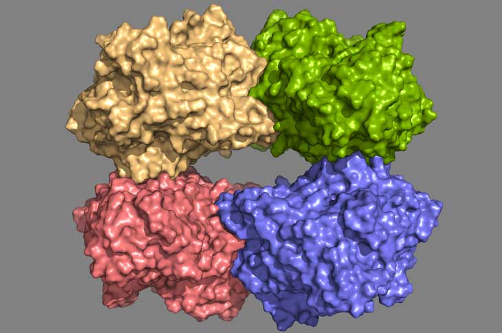 The essential dietary nutrient choline is broken down in the human gut by the microbial enzyme CutC (surface representation of structure shown), Balskus discovered. Studies of mice suggest that this enzyme’s activity can limit the availability of choline during pregnancy, when it is needed by developing fetuses.