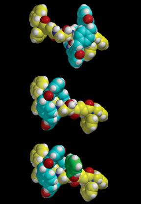 TAMING CHANCE. Thermal or Brownian motion moves a ring-shaped molecule (blue) from one side to another of a dumbbell-shaped molecule (yellow).