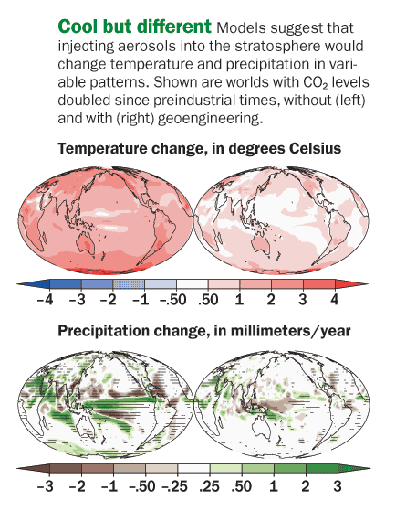 In principle, injecting sulfur in the right way could minimize precipitation changes, says climate modeler Ken Caldeira of the Carnegie Institution for Science in Stanford, Calif. Injecting aerosols uniformly around the globe would result in less disruption of global precipitation patterns than focusing injection at the poles, a strategy some have suggested for saving the ice caps, Caldeira reported in February in San Diego at a meeting of the American Association for the Advancement of Science. In fact, he said, a geoengineered climate would seem more like the one we’re used to than would a climate with doubled CO2 levels. Still, he noted, “stratospheric aerosols are likely to cause some damage in some places.”