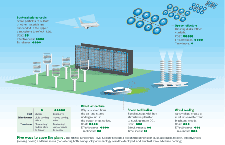 Keith’s idea may sound outrageous, but it is just one of many proposals for bumping the global thermostat down a couple of degrees by tinkering directly with the planet’s heating and cooling systems. Plans to cool the Earth range from shading it to fertilizing it, from seeding clouds to building massive supersuckers that filter greenhouse gases from the air. The schemes are all part of a growing field known as geoengineering: a subject once taboo for all but the scientific fringe, but now beginning to go mainstream.