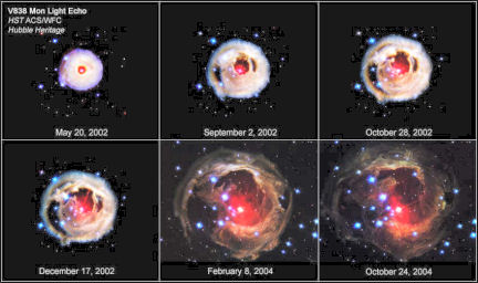 About 2 months after V838 Monocerotis’ discovery, astronomers awoke to the artistic side of the odd star: It had begun to show light echoes. Similar to the sound of a hand clap reverberating from the walls of an empty ballroom, flashes of light from the star’s outburst scattered off clumps of surrounding dust, setting them aglow like a string of lightbulbs that switch on sequentially. The light echoes create the illusion of a halo of dust expanding faster than light, but the dust isn’t actually moving. The light simply brings different parts of the dust clouds into view at different times.