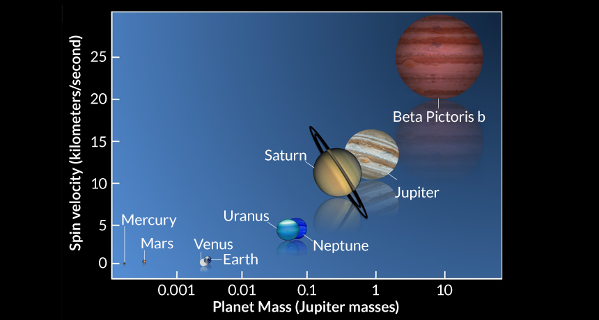 AS THE WORLD TURNS On Beta Pictoris b (upper right, in an artist’s illustration), a day is just over eight hours long. The exoplanet spins almost twice as fast as Jupiter does (when measured at the equator). The exoplanet’s spin continues a trend seen in our solar system: More massive planets spin faster.