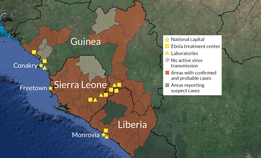 EBOLA IN WEST AFRICA The public health response to Ebola has centered on a “hot spot” where three counties meet.