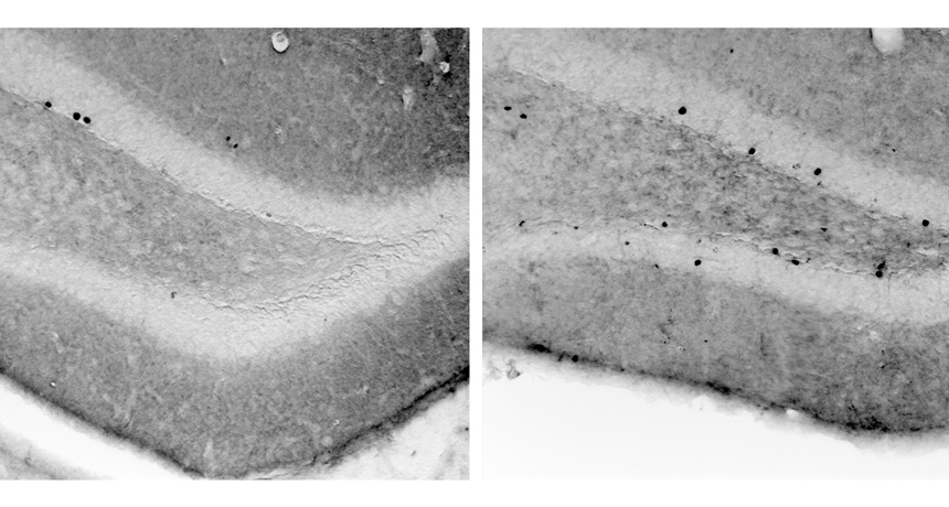 Genetically identical mice that thoroughly explored a complex cage grew more neurons (shown in black on right) in a key brain region than did mice that explored less (left), new research finds. The findings may shed light on how distinctive personalities arise even in identical twins raised in the same environment.