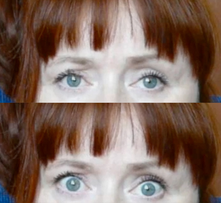 Compared with her normal state (top), a woman’s “hypnotically induced stare” (bottom) may mark an altered state of consciousness, researchers propose.