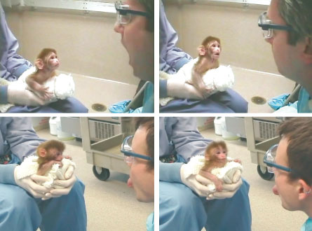 Very early in life, chimps and at least one kind of monkey react to faces, although the babies are flexible about whom they gawk at. Rhesus macaques just 3 days old lip smack and stick out their tongues if a human adult does so in front of them, Pier Francesco Ferrari of the University of Parma in Italy and colleagues have found. In 2009 in Current Biology, Ferrari and colleagues also reported baby macaques gazing into their mothers’ faces and lip smacking when mom did. Yet the babies don’t make faces at a gesturing human hand or a spinning disk.