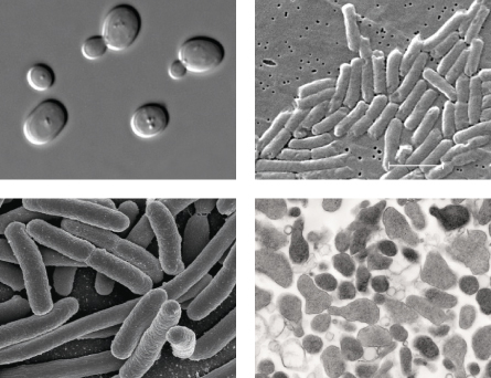 LITTLE BIG PLAYERS To carry out their synthetic feats, biologists typically turn to microbes that have short genetic instruction books and reproduce quickly. Organisms worthy of note include, clockwise from top left, Saccharomyces cerevisiae, Salmonella, Mycoplasma genitalium and Escherichia coli.