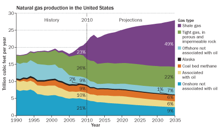 Today hydraulic fracturing is used in about nine out of 10 onshore oil and gas wells in the United States, with an estimated 11,400 new wells fractured each year. In 2010, about 23 percent of the natural gas consumed in the United States came from shale beds.