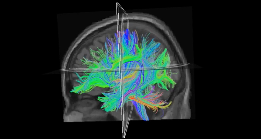 MISSING LINKS Connections between language-processing regions of the brain (shown here as colored links in a diffusion tensor image) may be broken in people with dyslexia, new research finds.