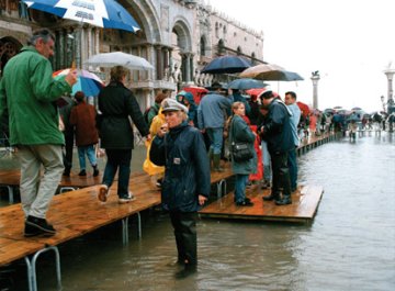 WALKING ON WATER. A policewoman directs pedestrian traffic on temporary scaffolding in St.