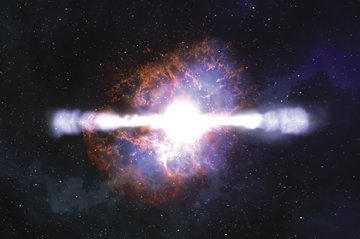 According to a leading theory, most gamma-ray bursts arise when the core of a massive, rapidly rotating star collapses under its own weight. The collapsed core becomes a black hole, which shoots out jets of material at nearly the speed of light, hurling the star’s outer layers into space. Collisions between lumps of material in the jets generate the gamma-ray bursts, the most powerful explosions in the cosmos since the Big Bang.