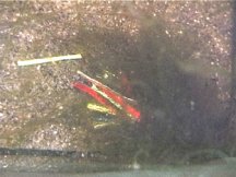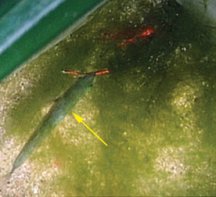 PREFERRED PAD. Stickleback females in the lab prefer algal nests with colorful foil strips (above). A male (below, arrow) brings home a red strip to brighten his prospects. Östlund-Nilsson and Holmlund