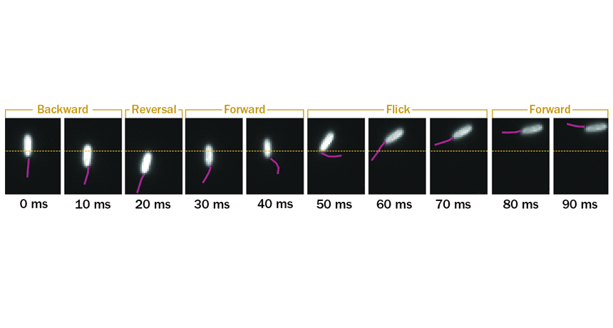 TINY RUDDER Over the course of 90 milliseconds, a bacterial cell (Vibrio alginolyticus) makes a hard right turn. It does so by backing up, moving forward and letting the base of its taillike flagellum buckle, researchers have discovered.