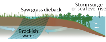 Thick, organic peat soil is the building block of many wetlands, including the Everglades, says Fred Sklar, director of the South Florida Water Management District’s Everglades division, based in West Palm Beach. But peat soil is fragile: Too little freshwater and it dries up. And worse, the combination of dwindling freshwater and increasing saltwater inundation is a one-two punch, “a kind of turbo boost, allowing the soil to break down,” Davis says. Chemical or biological changes within the peat soil — scientists aren’t sure exactly what — then trigger a sudden collapse. Soil elevation drops rapidly, exposing the roots of the saw grass, which eventually die.