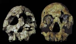 Newly discovered skull of Kenyanthropus platyops (left) flanks a skull of Homo rudolfensis, which may be reassigned to the genus Kenyanthropus.
