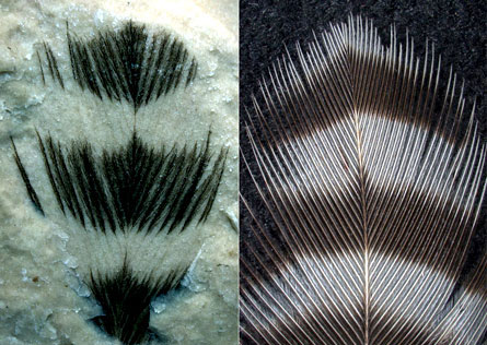 FOSSILIZED COLOR? The pigment of dinosaurs or early birds may have been preserved. Black stripes on a fossilized Cretaceous feather (left) from Brazil resemble marks on a modern woodpecker feather (right).
