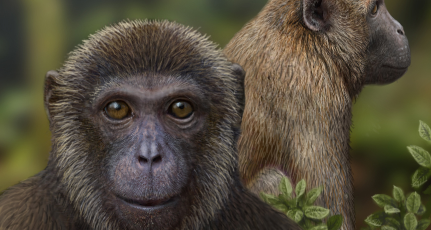 LONG-GONE PRIMATES Using new fossils and previously recovered remains of related creatures, an artist created portraits of an ape (left) and a monkey (right) that inhabited East Africa 25 million years ago.