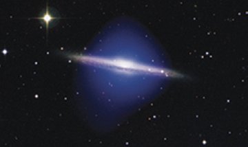 X-ray observations of the massive spiral galaxy NGC 5746 reveal a spherical halo of hot gas (blue) extending 60,000 light-years on either side of the galaxy’s visible disk (seen edge on as a large white streak).