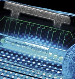 SQUEEZE PLAY. This animal-on-a-chip prototype, shown tilted on edge, sustains cells in thin channels (green).
