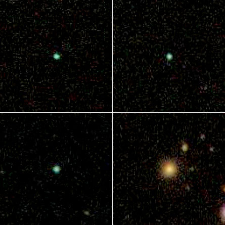 GREEN PEAS These portraits show a handful of rare, newly discovered galaxies, dubbed Green Peas because of their color and shape, that may be nearby analogs of distant galaxies undergoing an intense wave of starbirth.