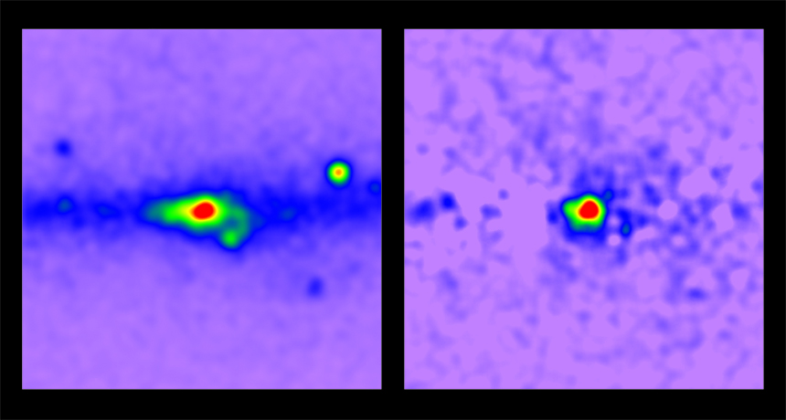 GAMMA GENERATOR Gamma-ray emissions from the center of the Milky Way appear as colors other than purple in these images. The panel at right shows that when emissions from known gamma-ray sources are removed, a strong signal about 10,000 light-years across remains. A team of physicists argues that dark matter particles are responsible for those gamma rays.