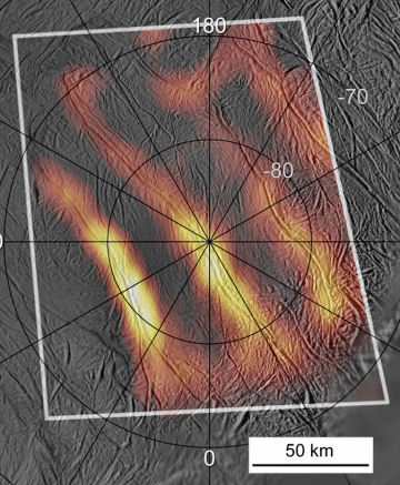 The brightest fracture, dubbed Damascus Sulcus, registered temperatures as high as 180 kelvins. That’s more than 100 kelvins hotter than elsewhere in the polar region. Calculations published in Nature last year suggested that the little moon’s heat comes from friction generated when the fissures’ walls rub against each other as Saturn exerts its gravitational pull. But the new data don’t support that idea, says Larry Esposito of the University of Colorado at Boulder and head of Cassini’s ultraviolet imaging spectrograph team. The moon may be generating heat from somewhere closer to its core, perhaps by the flexing of the moon as it orbits Saturn, comments Princeton University’s Christopher Chyba.