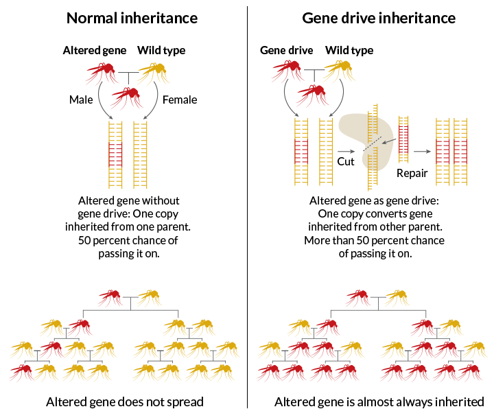 This approach has special appeal for weakening the disease-carrying dexterity of mosquitoes. A gene drive carried by 1 percent of mosquitoes in a population can be inherited so efficiently that in about 20 generations, 99 percent of all the mosquitoes will carry it, Burt calculates.