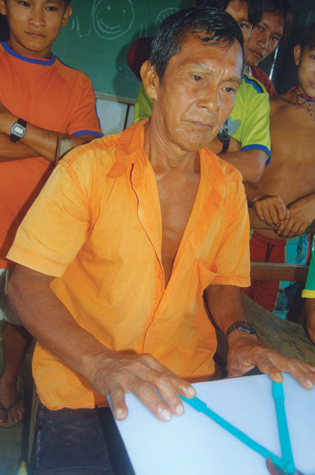 ANGLE MAN Taking part in a study that looked at intuitive understanding of geometric principles, a Mundurucú villager in Brazil’s Amazon basin uses a device provided by experimenters to estimate the size of a missing third angle from a partial triangle shown on a computer screen.