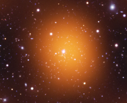The Phoenix Cluster, shown here in an image comprising microwave (orange), visible (red, green, blue) and ultraviolet (blue) light, is the most fertile galaxy cluster observed so far, birthing more than 700 stars per year.