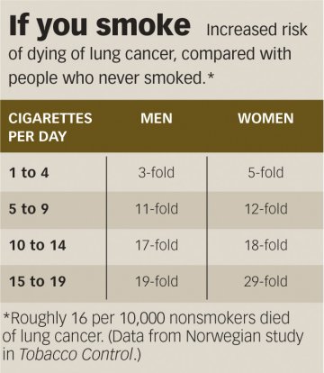 In the other study, Norwegian researchers tracked 42,722 people first contacted during the 1970s. When the scientists assessed death records at the end of 2002, they found that men who smoked only one to four cigarettes a day still faced triple the risk of dying of lung cancer that nonsmokers did. Women who smoked that few cigarettes showed a fivefold boost in risk.