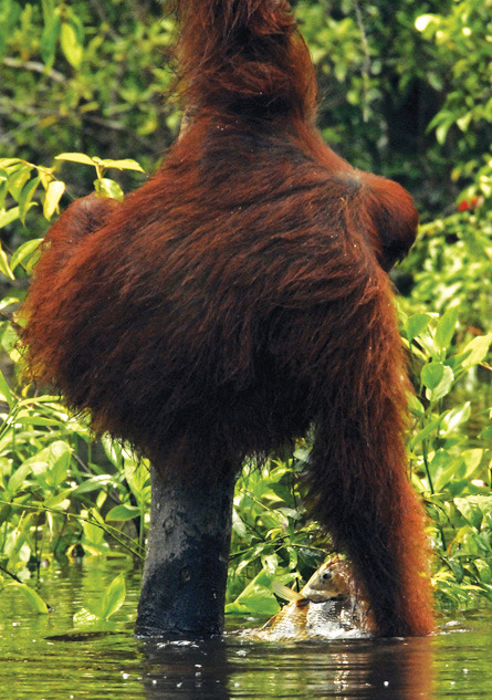 GRABBING A BITE An orangutan in Borneo plucks a catfish from a pond. A researcher who observed the apes catching and eating fish says that the earliest members of the human evolutionary family may have done the same.
