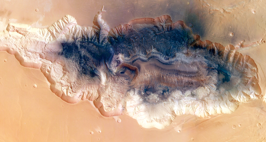 New images of Hebes Chasma (shown) from the European Space Agency’s Mars Express spacecraft suggest that massive landslides may have shaped the huge trough.