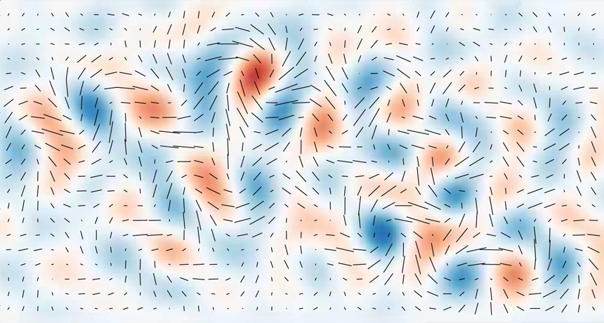COSMIC SWIRL Gravitational waves generated during a period of cosmic inflation twirl light from the cosmic microwave background, as seen in this sky map from the BICEP2 telescope. The lines trace the alignment, or polarization, of photons released after the Big Bang; the line lengths show the light’s intensity. The colors indicate how strongly twisted the polarization is, both clockwise (red) and counterclockwise (blue).