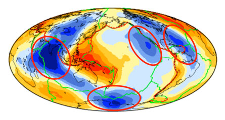 RESTING IN PIECES Earth’s gravitational field is much lower than average in some places (dark blue areas circled in red) because of water-rich material that lies over the dehydrated remnants of long-subducted tectonic slabs.