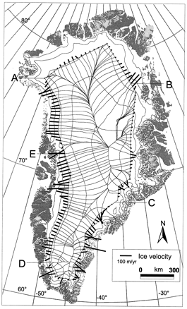 The thick bars bordering Greenland’s 1-million-square-kilometer central ice sheet show the relative magnitude and direction of ice flow.