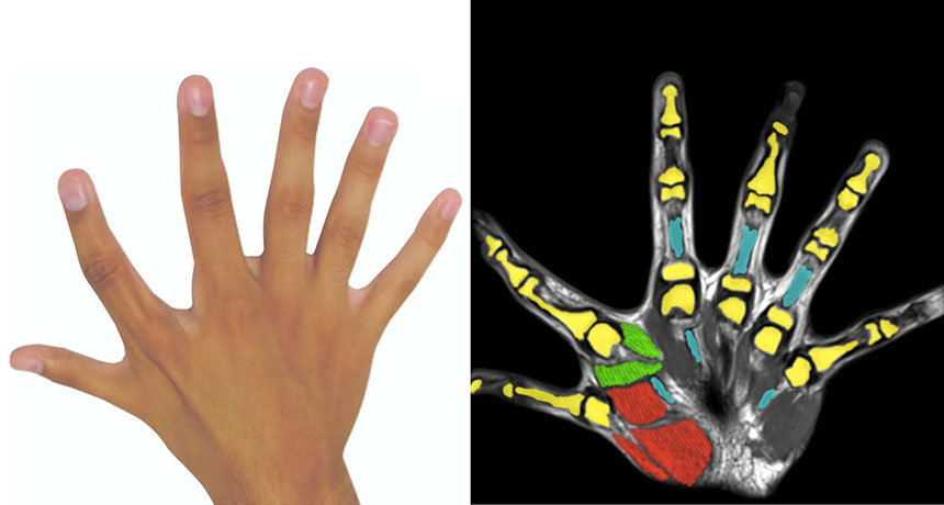 ALL TOGETHER NOW An extra finger on the right hand of a 17-year-old boy is controlled by its own muscles (red and green) and tendons (blue; bones are shown in yellow).