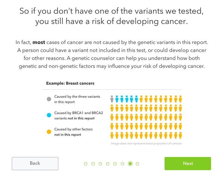 Most recently, in March, the FDA granted approval for the company to tell customers if they have one of three genetic variants in the BRCA1 and BRCA2 genes. Those three variants are responsible for about 74 percent of inherited breast cancers among people of Ashkenazi Jewish heritage. Less than 0.1 percent of people of other ethnicities carry these variants.